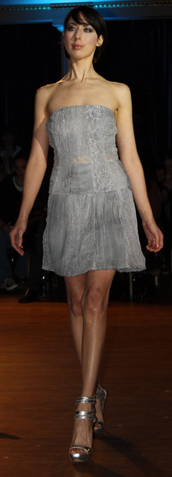 Fourth designer: Katharine Kidd presented by Gus Mayer. This collection was a little too sophisticated for my design aesthetic and there were only three dresses that I would want to wear. With that being said, this was a great collection with an even better crowd response. The tops, pants, dresses, and skirts featured had a dark color pallet of blacks, and deep grays with pops of blue, dusty rose, and muted tan. Lace, rouching, draping, and criss-crossed patterns were featured on most of the looks. And when the insanely beautiful white dress emerged, the crowd clambered with excitement and several audience members clapped. I would die for this dress. Oh my god…. I also loved the last few dresses shown, including the beautiful construction the designer came out with at the end. Gah. Garments like this made me wish a) I had them, and b) I had somewhere to wear them. Stunning.